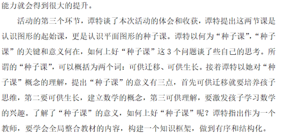 1. 品课议课视角:落实抽象与自主探索 夯实图形的再认识。 流程: (1)执教老师说课(结构化考虑)。 (2)备课组长评课。 (3)年级组教师评课。(随机2位)。 (4)其他教师评课。(随机2位)。 2. 谭特总结。 | ||||