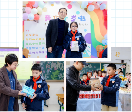 学生成长仪式正式开始之前,各班级举行了各具特色的庆祝活动,这是老师和家长给小月芽的第一份礼物。瞧,精美的班级布置、定制的专属蛋糕、精彩的歌舞节目,让所有的小月芽开怀畅笑。大家在喜悦与激动中,感受美好,在彼此分享中,懂得感恩。不仅如此,学校领导更是走进班级,给孩子们准备了各种“神秘大礼”。看,有特殊的地铁纪念品、种植榴莲树的花盆、珍藏的《红楼梦》书籍......一份份礼物让孩子们惊讶又感动。今天是小月芽们在班级里度过的第一次的集体生日,他们也用自己的方式对老师、家长的付出表示由衷感谢。四年前的小月芽们稚趣天真,跌跌撞撞走进属于他们的小学时代。仿佛只一瞬,你们已经长大。这四年是你们成长的四年,也是老师和家长们携手护航的四年。