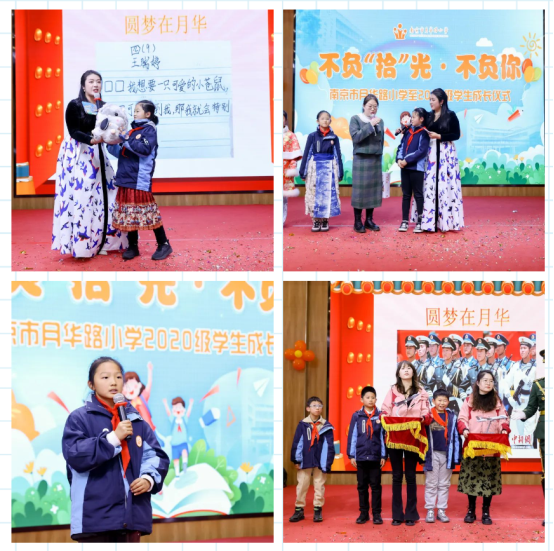 岁月如歌,三年前,你们怀揣着梦想走进月华园,如今,十岁的你们褪去稚嫩,再一次书写期待与美好。梦想是成长的一叶扁舟,月华园为每一位小月芽创造了造梦、追梦的机遇,在成长礼活动前期,学校收集了四年级每位小月芽们的梦想,开启了特别的月华圆梦企划。当梦想照进现实,所有的期待都将在此刻如约而至,念念不忘,必有回响。梦想是一定要有的,万一实现了呢?最激动人心的“圆梦”环节来啦!随着大屏的滚动,一位位小小追梦人幸运诞生。“我的愿望是一只可爱的小仓鼠,如果能抽到我,那我会特别的开心”,这份专属的幸运正式开启小月芽们数不尽的幸福与美好。主持人送上小小的仓鼠抱枕,希望能它成为小月芽追梦路上最温暖的抱抱。“成为设计师”坚定的话语、闪耀的目光,怀揣梦想的小月芽走向属于她的圆梦舞台,来自月小“华服社团”的圆梦大使高老师送上了戏曲服装设计盒子并发出诚挚邀约,梦想在一片又一片的裁片拼搭缝制成最美的华衣。在月华每一位孩子的梦想都不会被忽视,“想当校长”也不是不可能的事,得知咱们的小月芽有这样的梦想,夏校长亲自接待了孩子,倾听了孩子对于校园建设的思考,给与了最大的肯定与支持。孩子大胆去圆梦吧,月华是你最坚实的臂膀,为你遮风挡雨,祝你梦想成真。月华是孩子筑梦、圆梦的一方天地,更是孩子们发展友谊的小小桥梁。至善、湖东是一家,第四位小小追梦人的愿望是去月小湖东路校区送祝福,她的愿望也得到了湖东路校区四年级孩子们的关注,他们热情邀约,从至善到湖东,虽然有着不一样的校园文化,但彼此牵挂,团结奋斗的月华精神牢牢印刻在两校区孩子们心中。在小月芽们的共同期待中,最后一轮一次抽中三位追梦人现场圆梦。朱清、王青元和唐文宇都是小小军事迷,渴望探秘橄榄绿。因此,学校特别邀请了校国旗中队的高教官为孩子们送来祝福与礼物,邀请他们参与来年的“一日军营”体验活动。少年当有鸿鹄志,当骑骏马踏平川。祖国的未来属于你们,愿你们能保持热爱,梦想成真。