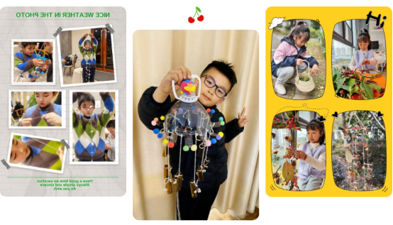 了解了风铃的起源后,小月芽们便收集废旧材料,如:鸡蛋托、纸杯、麻绳、塑料瓶、树枝、树叶等,搭配上扭扭棒、超轻粘土等材料,经过小朋友们的创意巧思,画一画、剪一剪、粘一粘、穿一穿,变废为宝,制作出了许多漂亮的手工风铃。