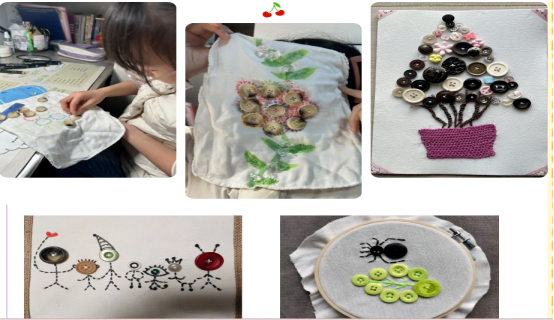 瞧,小月芽们践行着环保理念,把旧衣服上五彩缤纷的纽扣拆下收集起来,穿针、引线、打结、定位、进针、出针,灵巧的双手在小碎布间穿梭着,大树、蜘蛛等趣味形象跃然布上。一幅幅创意十足的纽扣刺绣画,把憧憬与梦想交织在一起!