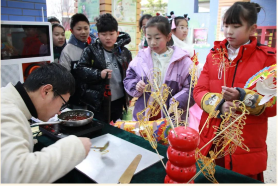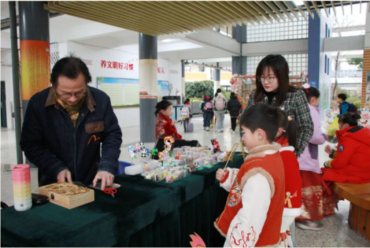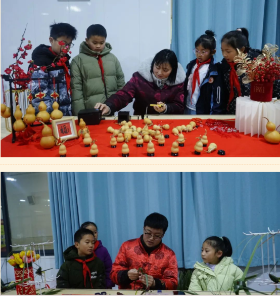 “非遗”是一颗特殊的种子,它连接着过去、现在和未来,承接着民族的文化和记忆。在月小,一切皆有可能。瞧,一次传承与创新的实践之旅正在火热进行。以勺为笔,融糖为墨,笔走龙蛇,糖倾河汉。糖画,不仅是一种甜蜜的艺术,更是优秀传统文化的传承。王军霞老师精湛的技艺,让湖东路的小月芽们开阔了眼界,他们看得如痴如醉,一个个跃跃欲试。“我要一条龙”“我喜欢爱心”“我要一把宝剑”……校园的空气中,弥漫着麦芽糖香甜的味道。传承千年的糖画,不仅仅是味道的传承,更是一种文化、礼仪和风俗的传承。“咦?这是葫芦吗?”体验完糖画的操作,小月芽们又被这“葫芦雕刻”吸引住了。在中华民族传统文化中,葫芦与“福禄”谐音,被人们赋予了美好的寓意。郭丽君老师说:“雕刻葫芦是个非常费眼睛的活,一开始学,稍不留神就会划破手,要求眼、心、手高度专一。”小月芽们听完频频点头,深刻理解了什么是“匠人精神”,那是近于苛刻的严谨,是超乎常人的执着。用大自然里肆意生长的草叶,可以编织出一个怎样的童趣世界?看,至善路的小月芽们正跟着郭涛老师学习制作草编。撕叶、打圈、穿孔、按压、划缝、拉紧……步骤看似繁琐,实则暗藏玄机。小月芽们眼手并用,一个个化身为草编织梦人,去实践、去传播、去弘扬。