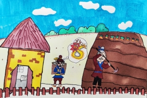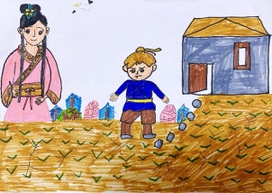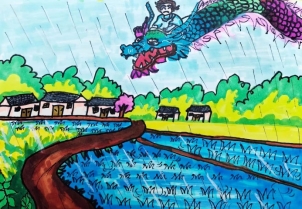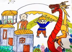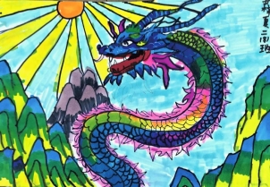 眼前的这个地方在阳光的照射下闪着金光,定睛一看,山间正盘踞着一条巨龙,身上的鳞片泛着金光,阿龙一步步靠近想要看清它,突然听到一个深沉的声音说:“你是谁?为何来到这里?”吓得阿龙一个激灵,阿龙用微弱的声音回答道:“我听说这里住着龙,我是来求雨的。”他甚至不敢抬头看龙。龙笑笑说:“你的声音太小了,我听不清,勇士从来不这么说话,我只和勇士对话。”阿龙鼓起勇气提高嗓门再次重复了之前的话。