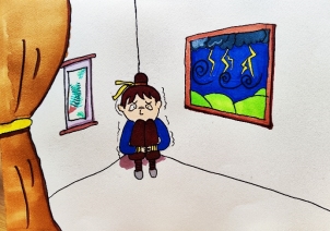 阿龙决定前去东方寻找龙,即便他怕黑、胆小如鼠,但他迫切想要拯救庄稼。他追逐着太阳,飞快的赶路,直到月亮爬上山头他还依然没有到达东方,他点燃一盏灯,小心翼翼的前进,但双腿却不自觉的颤抖,突然一只大鸟飞过,吓得他差点哭出声来,他把自己蜷成一团,小声的抽泣,这一刻他好想放弃,但他又想起他必须拯救庄稼,不让爷爷和乡亲们挨饿,他擦擦脸上的泪珠,艰难的前行,因为他不想再耽搁一分一秒,终于在日出时到达了东方。
