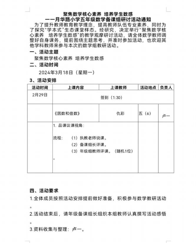 2. 集体备课《因数和倍数》 。将重难点知识进行梳理,将习题融入日常教学,落实 “双减政策 ”的课堂教学 。