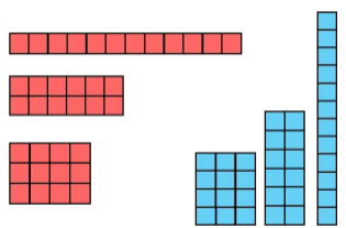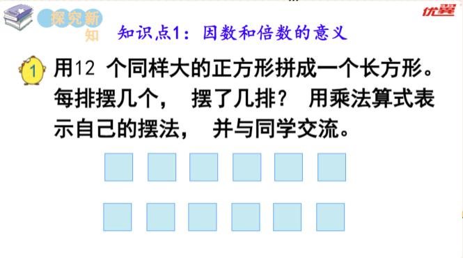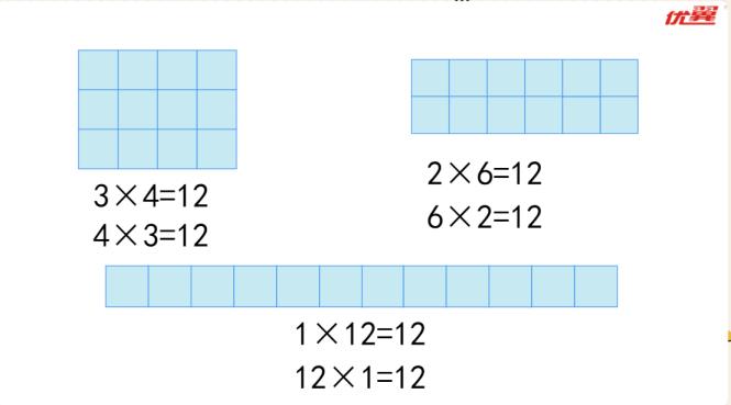 这样看来,用 12 个同样的正方形摆长方形,一共有 3 种不同的摆法,对应 3 个不同的算式, 因 数和倍数的知识就藏在像这样的算式中 。