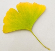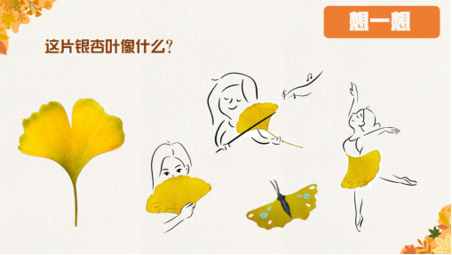 2. 构思设计,拼摆修整。(边演示边给出提示) (1)问题引导。 问题:怎么把树叶变成美丽的图案呢? (教师投影示范,选择一片银杏叶。)构思:这片银杏叶像什么?