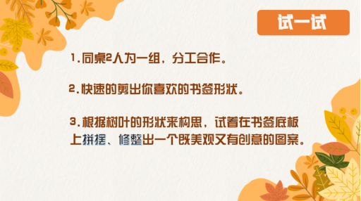 预设:裙子,用银杏叶拼摆小女孩穿着裙子的形状。 问题:还需要哪些树叶? 教师示范拼摆。 (预设:“小女孩”可用银杏叶做身体,还需要头和四肢,可以用叶片修剪成想要的形状,“小女孩”的裙子可以通过多张银杏叶重叠,做成蛋糕裙。) (2)拼摆图案。 同样的银杏叶,还可以摆成不同的图案。 (板书)拼摆 预设:蝴蝶、花瓣、四叶草、金鱼、狐狸、扇子、圣诞树等。 预设:蝴蝶,两片银杏叶做翅膀,旋转角度更生动,增加一些花朵,版面更美观。 预设:金鱼,旋转角度,倾斜一些,添加水泡、水草,画面更丰富。 (3)巧用修剪、添加、重叠、旋转等修整的方法,图案会更生动、美观。 (板书)修整 书签展示:小朋友们的想象力真丰富,老师把大家的想法都变成了现实,制作成了书签,我们一起来看一下吧。 (4)学生尝试拼摆。 和同桌的小伙伴一起试着摆一摆。拼摆要求:摆的时候,开动脑筋,要根据树叶的形状来构思。修整的时候要细致一些。这些树叶特别薄,一定要轻拿轻放。期待大家能拼摆并修整出既美观又有创意的图案。 (板书)美观、有创意 | 思考探究。