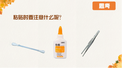 3. 学习粘贴技巧。 (1)固定图案。 问题:经过修整的图案怎么固定在底板上呢? (板书)粘贴 视频:粘贴时的注意点。 预设1:粘贴时,白乳胶量少,涂抹均匀。 预设2:树叶容易破,力度要小。 预设3:取一张,贴一张,不要将叶片全部拿下来。 要点:粘贴时,取少量白乳胶,均匀涂抹;同时记住拼摆的图案,合理安排粘贴顺序。 (2)巧用工具。 工具:棉签。 作用:涂抹时能控制白乳胶的用量。 | 学生观看视频,掌握粘贴时的注意点,并学会借助工具完成粘贴步骤。