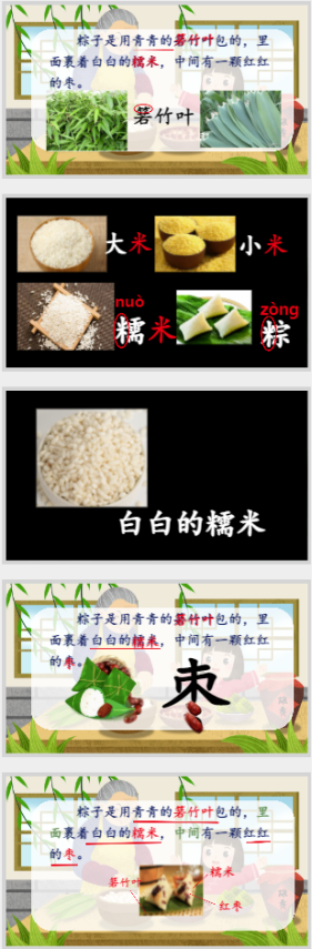 ④(再次出示词组:青青的箬竹叶 白白的糯米 红红的枣)引导学生发现,箬竹叶是香香的,糯米是黏黏的,枣子是甜甜的。