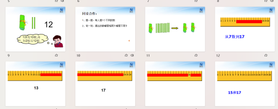 每次要求学生摆好的就举手,并说说自己是怎么摆的:左边摆一捆,右边摆几根,合起来是十几。
