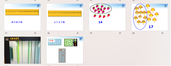 互动游戏是对20以内数的顺序、数的大小、数感的训练,同时调节课堂气氛,吸引一年级学生的注意力。生活中的数通过故事情境的描述、直观素材的呈现让学生切身感受数的应用,同时也穿插认数、读数、比大小的训练,并引导学生联系生活实际解决简单问题。 练习中提供形式多样、内容丰富的数数、读数活动,感受11-20各数大小。 | |||