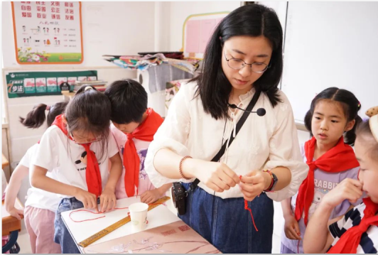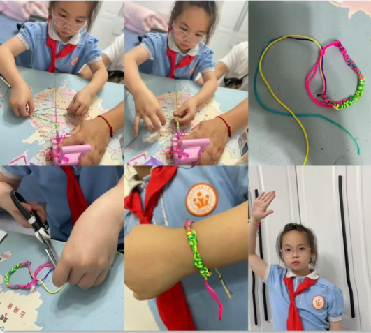 “彩线轻缠红玉臂,小符斜挂绿云鬟。”五彩绳又称五彩丝、五色丝等,是端午节的重要文化符号之一,它有祈福纳吉的美好寓意,象征着保护和祝福。在爸爸妈妈的指导下,低年级的小月芽们精心挑选出心仪的彩绳,细致认真地将它们梳理整齐。几根丝线并列放置,从一端开始缠绕编织,一圈又一圈,好似在绘制一幅充满奇幻色彩的画卷。五彩斑斓的丝线仿佛是跳跃的精灵,一双双灵动的手在丝线上翩翩起舞。没多久,精美的五彩绳便在他们的巧手下惊艳亮相。小小的五彩绳凝聚着孩子们的智慧。制作完成后,他们还将彩绳送给了自己的父母,祝福他们平安吉祥,端午安康。