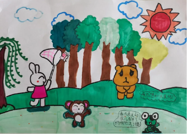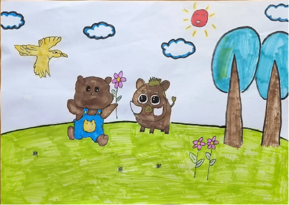 在叮咚山的深处,有一片茂密而又广阔的森林,这里住着许多小动物,在一个晴朗的早晨,小动物们欢快的在草地上打滚,嬉闹,有的还在唱着歌:“春天真美好,花儿都开了,杨柳树枝对着我们弯弯腰......”唯独小花熊皮皮躲在一边的角落里,一脸羡慕地看着他们,他多想和他们一起玩闹,一起唱歌!可是,大家都说他是“倒霉大王”,都嫌弃他,不想和他一起玩。