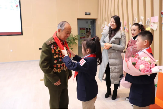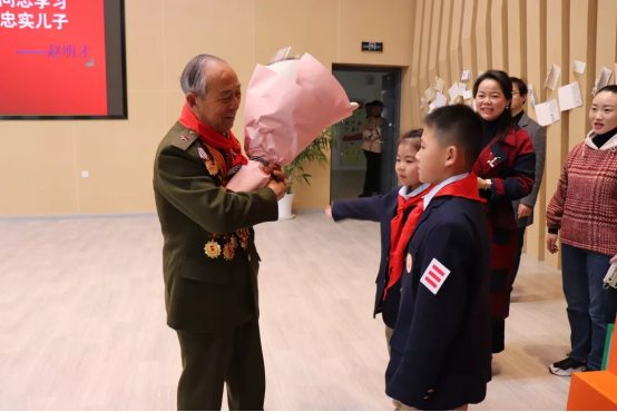 当赵老走进会场的时候,月小娃们响起了热烈持久的掌声,欢迎赵爷爷的到来。少先队员司一然为赵明才爷爷系上鲜艳的红领巾,丁一行同学为赵爷爷献上了美丽的鲜花。