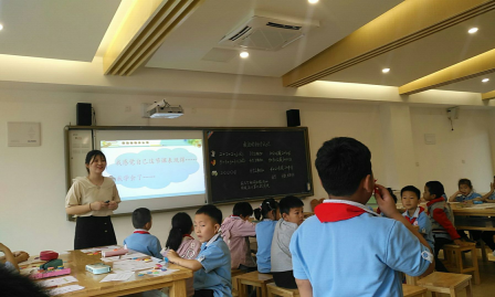 第二节课是由月小青年教师王雪老师执教《乘法的初步认识》。王雪老师的这节课是建立在学生已经学过加法、减法的基础上,是学生学习乘法的开始,由于一年级学生一直利用加法解决数学问题,没有乘法的概念,加之这个概念又难以建立,因此一节乘法的初步认识课,能使学生知道乘法的含义,为以后学习乘法的其他知识奠定十分重要的基础。在学习新知的过程中,王雪老师以激发学生学习兴趣为主,以小松鼠带着学生们参观动物学校为情境贯穿全课,让学生在有趣的情境中认识“几个几”、在操作中加深对“几个几”的理解。然后通过数量递增的电脑图创设认知冲突,让学生产生学习乘法的强烈需要,并通过对比,感受求几个相同加数的和用乘法计算较简便。最后在三个层次的练习中让学生巩固新知,内化运用。整节课学生学习兴趣浓厚,课堂参与度高,收到了很好的教学效果。在这充满“童趣”数学课中,王雪老师始终让儿童站在“课中央”,给学生提供充分的思维表达空间和活动操作空间,在这样的过程中,生生互学,师生导学,学生的思维也随之得到潜移默化的提升。